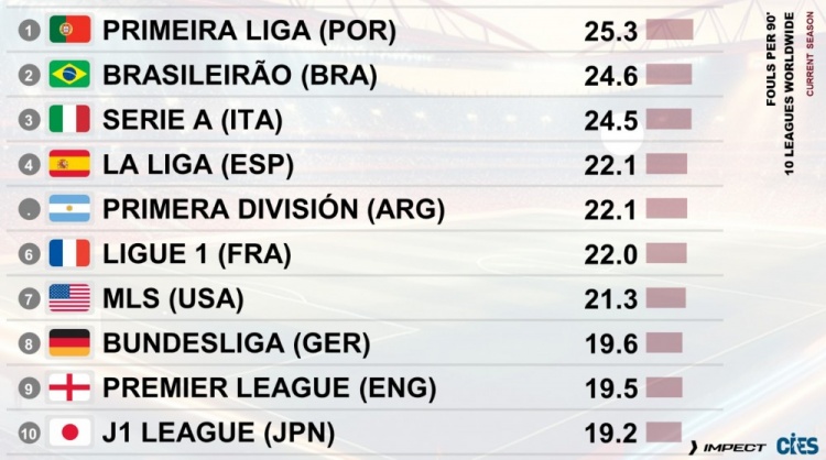 10月13日讯 CIES足球天文台统计了内行联赛每90分钟犯规情况,其中葡超以25.3次犯规位居榜首,巴甲则以24.6位居次席。