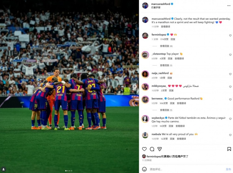 本场比赛拉什福德首发出场送出助攻,赛后他也在社媒晒出全队合照,配文写谈:“理解昨天的比赛成果不是咱们念念要的,但联赛是一场马拉松而不是短跑,咱们会持续拼搏!”