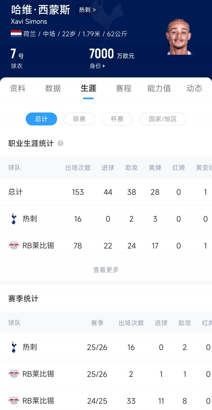 本赛季加盟热刺后,哈维·西蒙斯仍是代表球队出战了16场比赛,出场时刻937分钟,仅孝顺2次助攻,莫得赢得进球,热刺的战绩比拟开季时也急转直下。