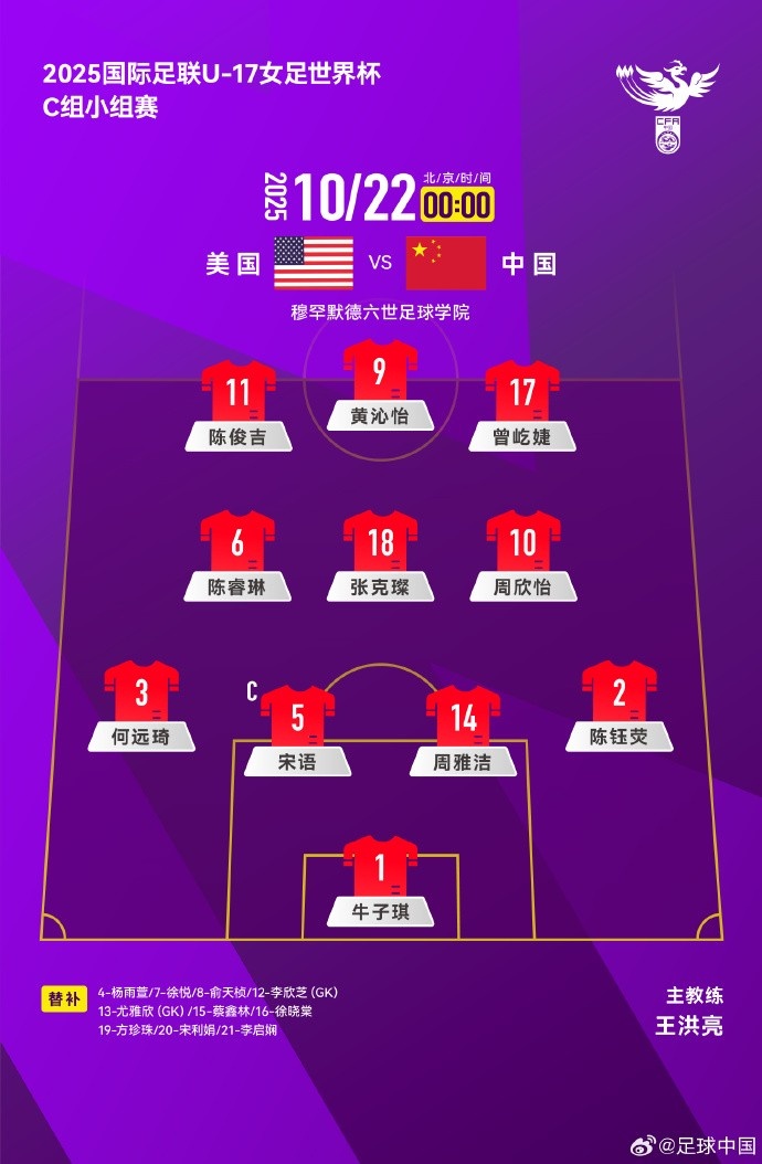 10月21日讯 2025海外足联U-17女足寰球杯C组小组赛第2轮,好意思国队VS 中国队首发名单出炉!