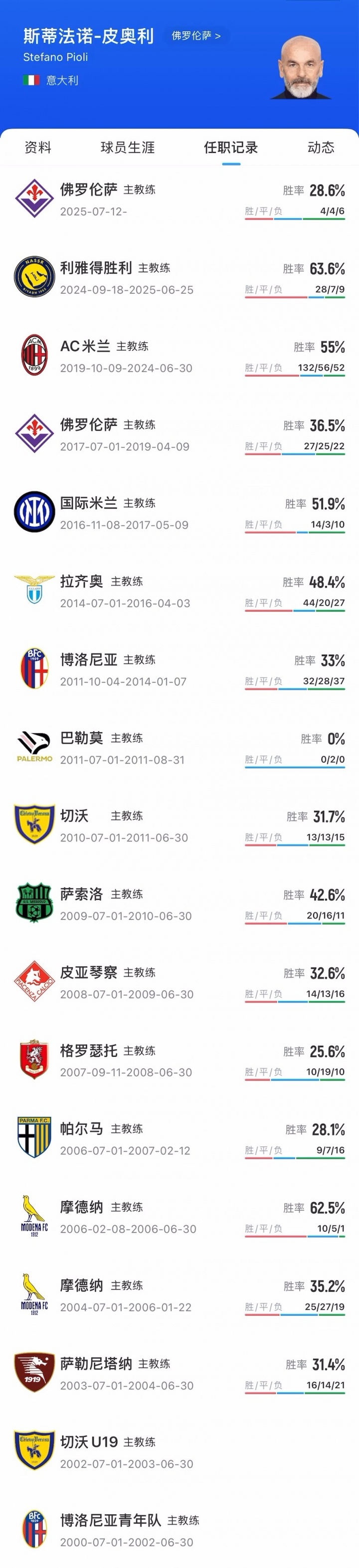 佛罗伦萨足球俱乐部晓喻,自本日起撤消皮奥利一线队主锻练职务。俱乐部感谢皮奥利锻练过甚团队在责任本领发达出的专科精神。