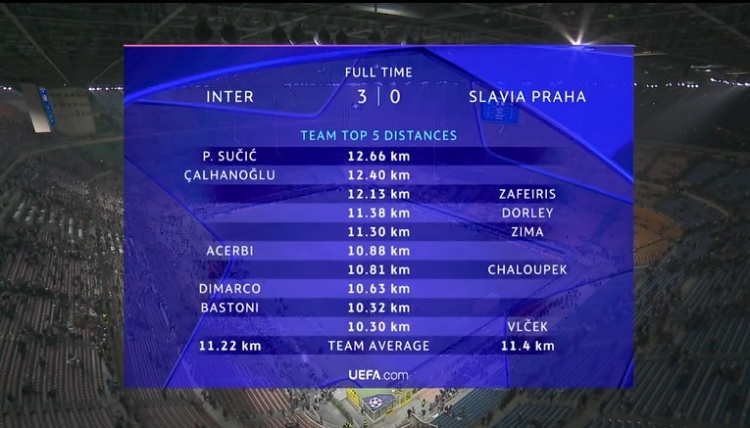 本场比赛国米方面跑动距离最多的是苏西奇的12.66km,其次为恰尔汗奥卢12.40km,之后辞别是阿切尔比10.88km,迪马尔科10.63km,巴斯托尼10.32km。