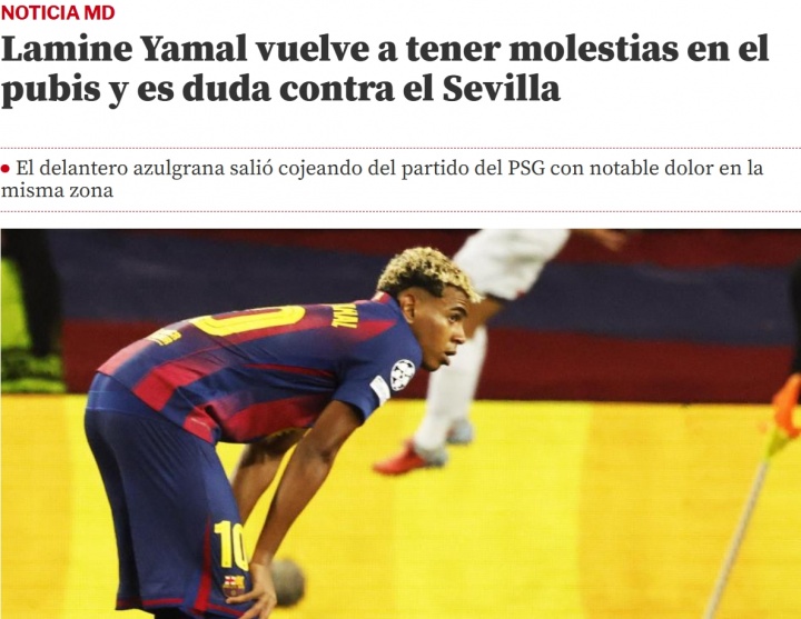 世体暗意,亚马尔的耻骨区域再次出现严重不适,此前他曾因为该区域受伤而缺阵了约三周技艺。