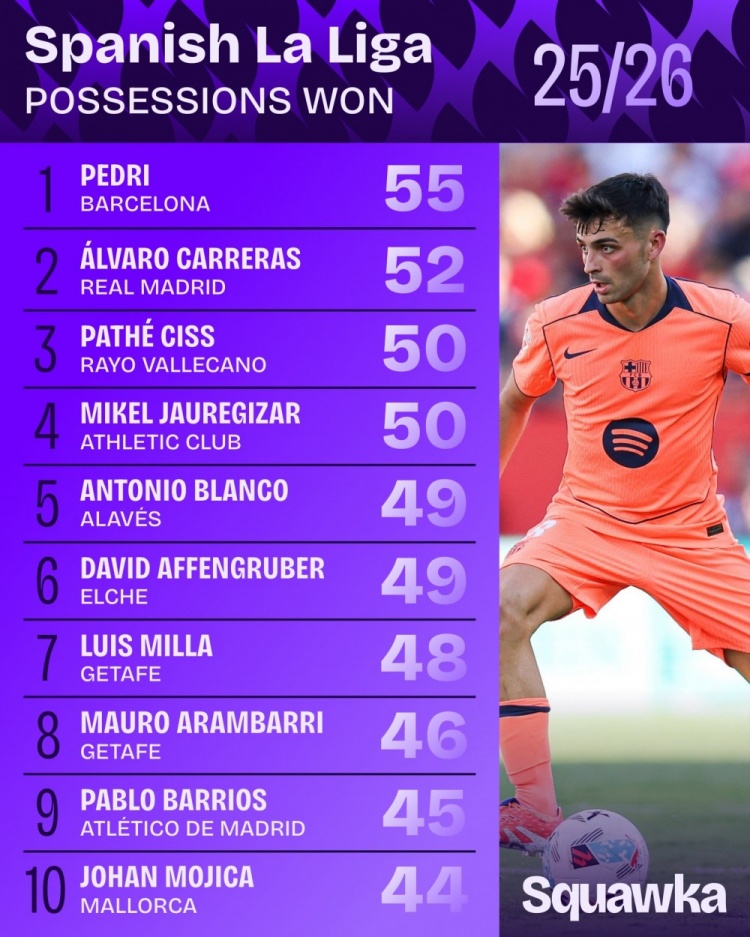 10月7日讯 日前,Squawka统计了本赛季西甲夺回球权次数排名,佩德里55次居首,卡雷拉斯52次第二。