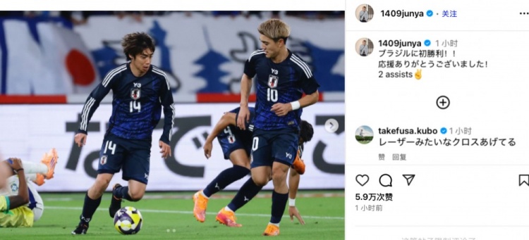 久保建英、三笘薰、长友佑齐为这条社媒点赞,久保建英还挑剔说念:“你的传中如激光般精确。”