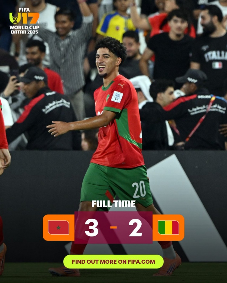 U17寰宇杯1/8决赛摩洛哥3-2打败马里,1/4决赛将对阵巴西