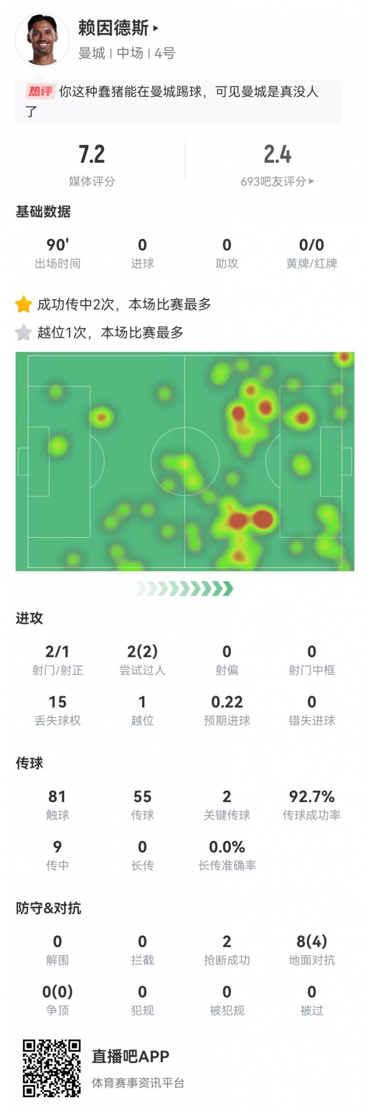 11月26日讯 曼城在本轮欧冠0-2不敌勒沃库森,赖因德斯本场数据如下: