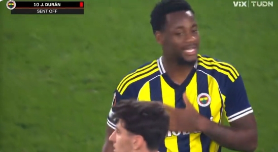 11月28日讯 欧联杯联赛阶段第5轮,费内巴切1-1战平费伦茨瓦罗斯,费内巴切时尚杜兰在补时阶段头顶敌手,被裁判红牌罚下。