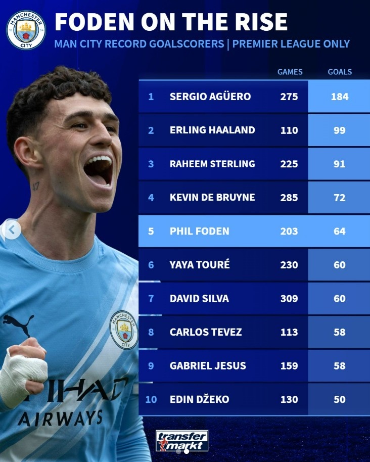 曼城队史英超弓手榜:阿圭罗184球居首,哈兰德次席,福录取5