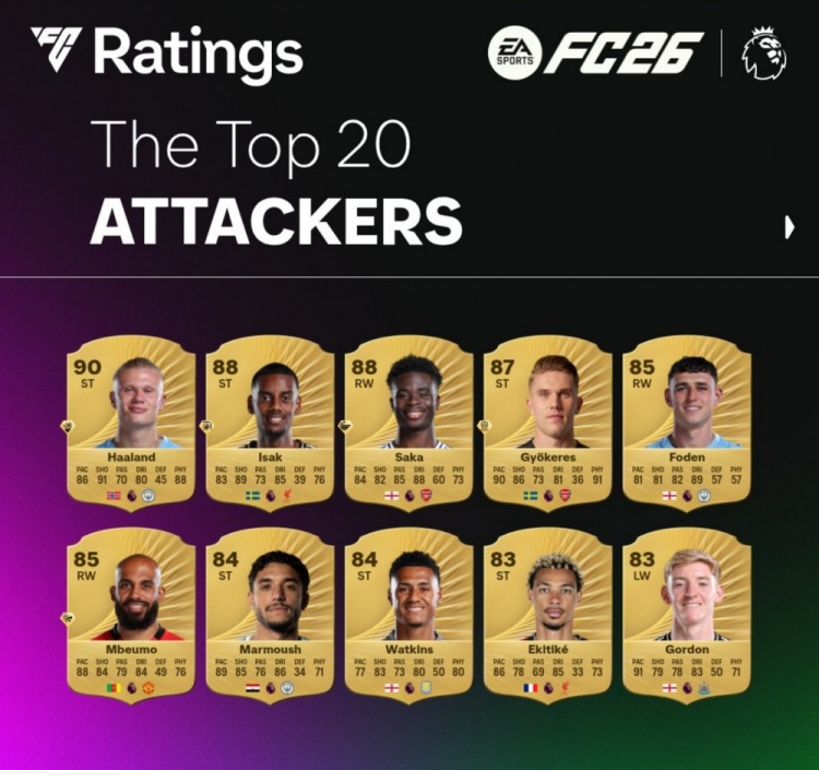 FC26官方英超抨击手评分榜:哈兰德90最高,伊萨克、萨卡88