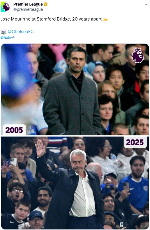 英超官推晒本菲卡主帅穆里尼奥:斯坦福桥的若泽-穆里尼奥,20年当年了……
