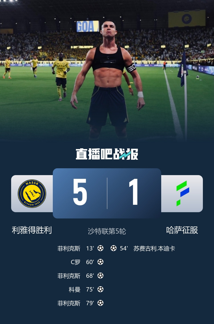沙特联第5轮,利雅得生效5-1大捷哈萨驯服,菲利克斯帽子戏法,C罗寰球波。