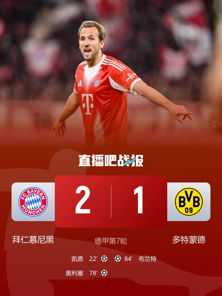 德甲第7轮,拜仁2-1多特蒙德拿下德国国度德比,凯恩、奥利塞进球。