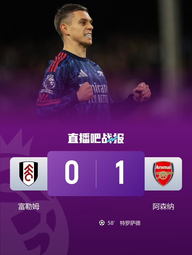 联赛3连胜!阿森纳1-0富勒姆3分领跑特罗萨德制胜加布里埃尔助攻