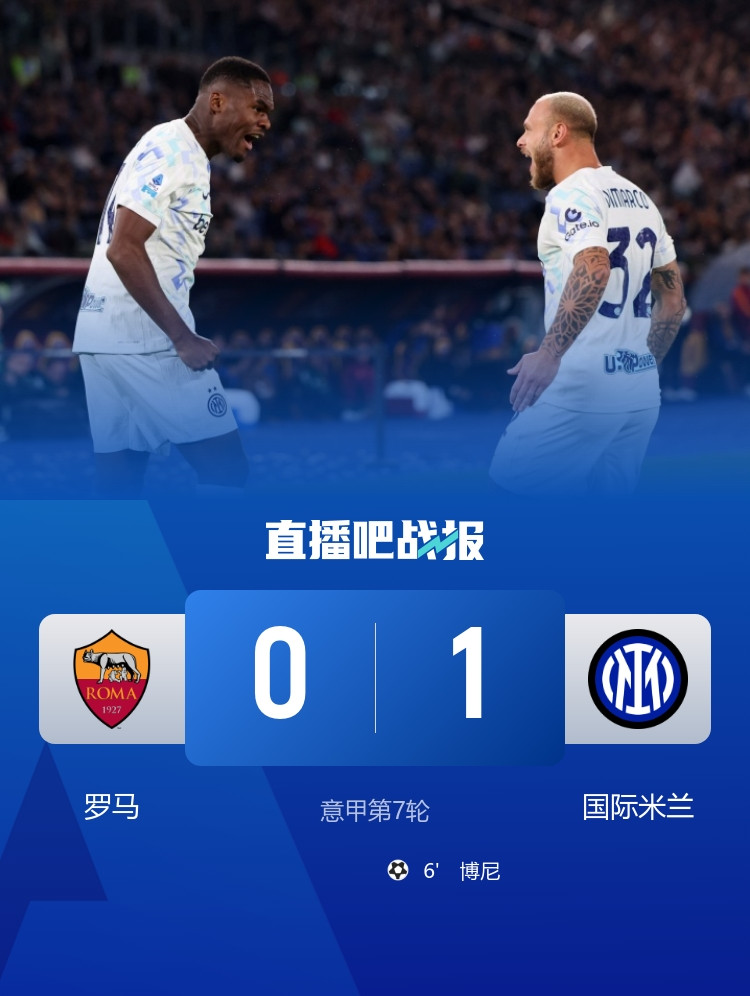 意甲第7轮,海外米兰1-0客胜罗马,博尼制胜。