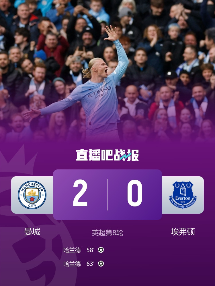 英超联赛第8轮,曼城2-0战胜埃弗顿,哈兰德梅开二度,福登缱绻两球。
