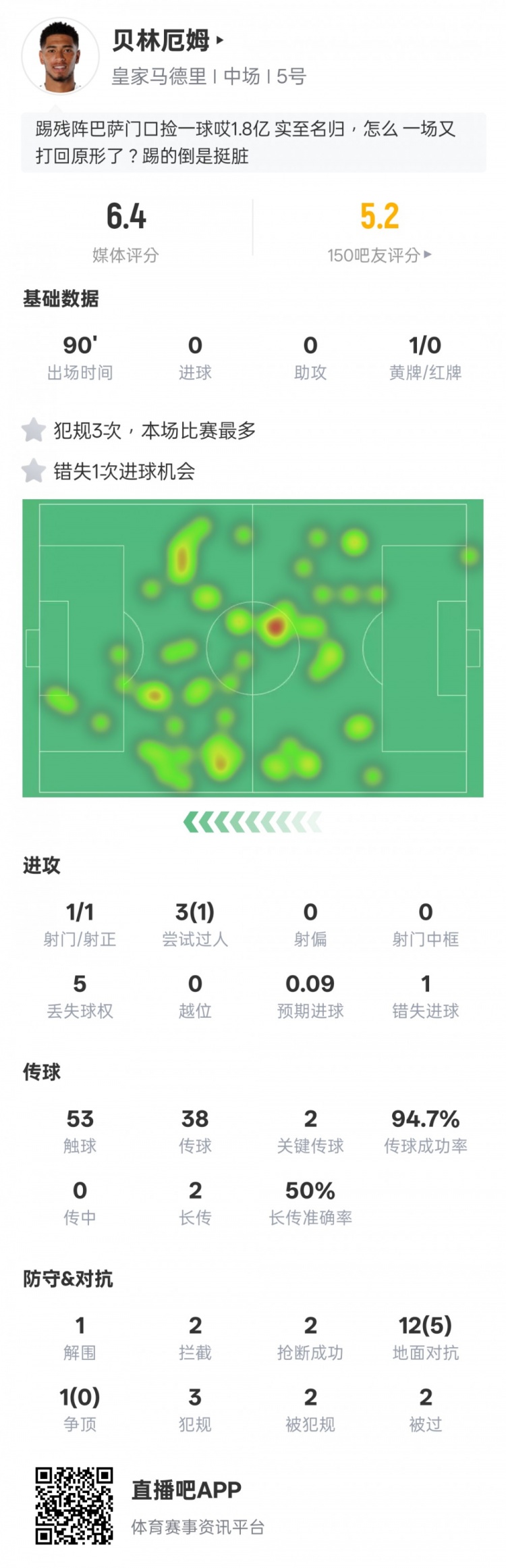 贝林厄姆本场比赛数据: