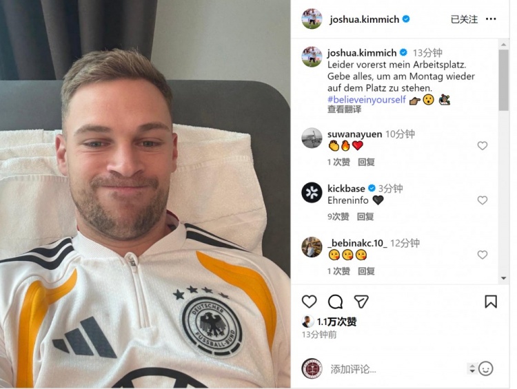 基米希社媒晒出我方在医疗室的相片,并写说念:“缺憾的是这里暂时成为了我的责任口头,我会逸以待劳,争取鄙人周一(对阵斯洛伐克)重返赛场。”