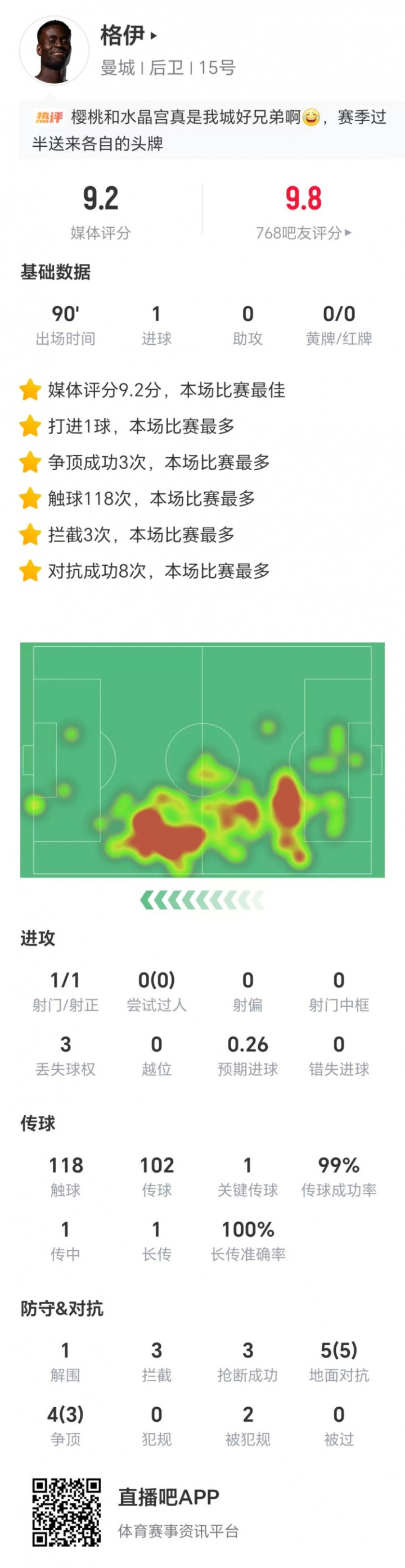 直播吧4月13日讯英超第32轮赛事 ,曼城在斯坦福桥以3-0的比分完胜切尔西。本场赛事 ,曼城中卫格伊表现抢眼,除了很好地完成自己的本职工作外,他还有1粒得分 入账。
