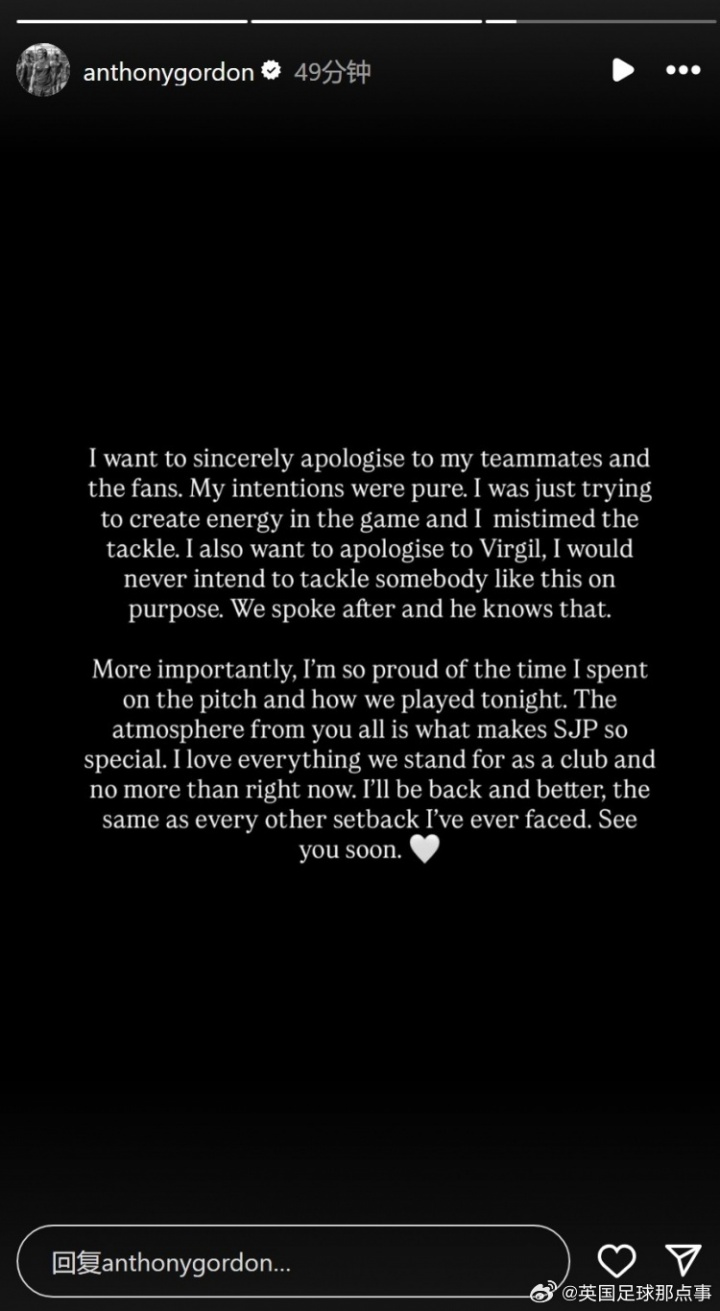【不是有益的】纽卡斯尔联2-3利物浦的比赛,戈登铲倒范戴克,染红离场。赛后戈登在社媒上说念歉: