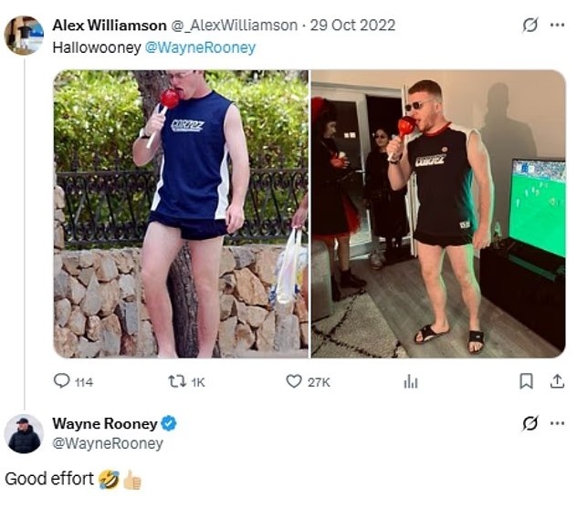 自称鲁尼超等粉丝的亚历克斯-威廉姆森,在2022年万圣节穿上了险些一模相似的服装,而此举得胜引起了鲁尼本东谈主的贯注。鲁尼在威廉姆森发布在相片下方接头谈:“利弊。”