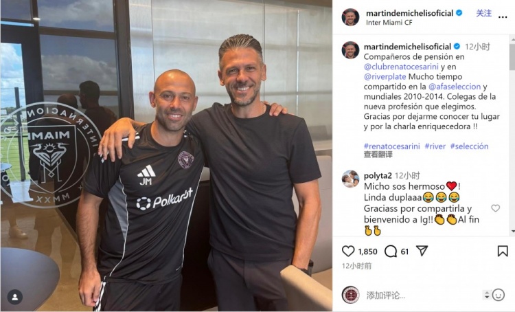 德米凯利斯打听迈阿密海外俱乐部,并与迈阿密海外主帅、昔时队友马斯切拉诺合影,他在应答媒体上晒出合照,配文:“我在切萨里尼(河床青训)和河床的室友,咱们不仅在2010年、2014年宇宙杯上为阿根廷并肩走动,如今更成为证实同业。感谢你让我恍悟你当今的寰宇,此次疏导令我受益匪浅。”