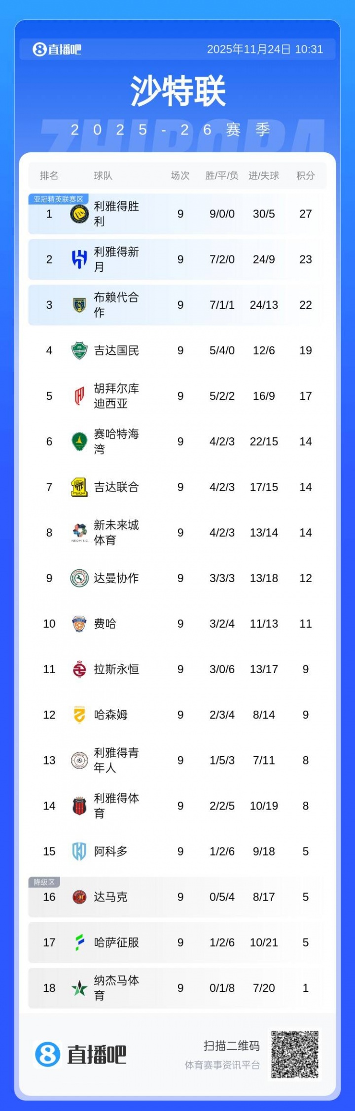 沙特联积分榜:成功全胜4分领跑,眉月不败居第2,卫冕冠军仅第7