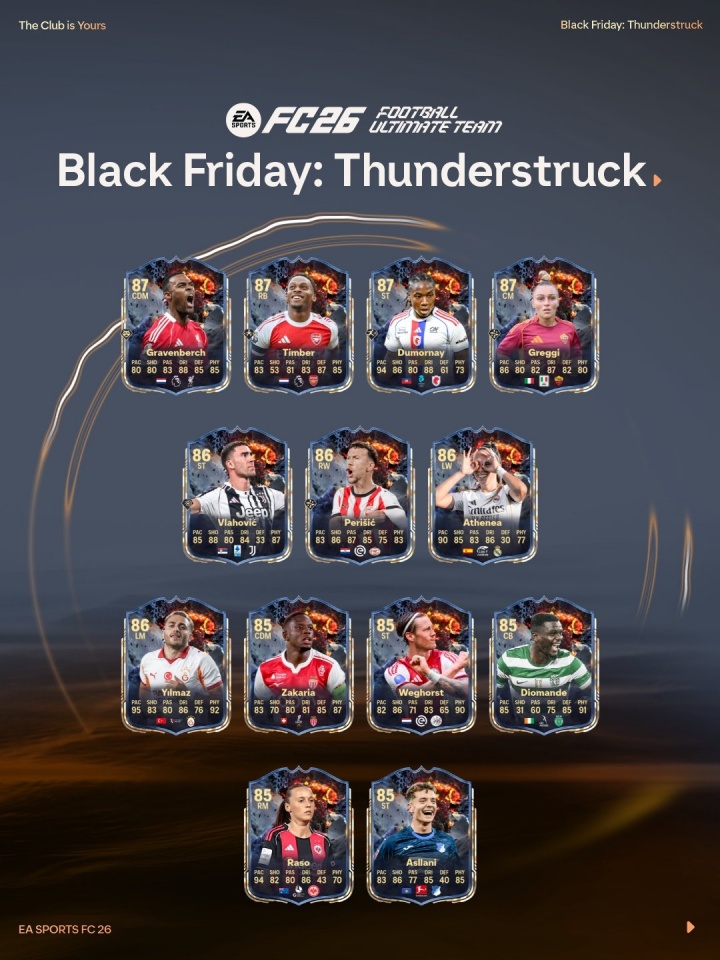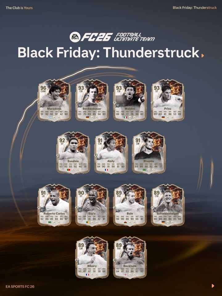 11月29日讯 北京技术昨日晚间EA FC26发布了“玄色星期五”的最新当作——雷霆当作球员卡池,其中现役球员方面贝林厄姆、罗德里领衔,传说球员方面马拉多纳、贝肯鲍尔、马尔蒂尼等传说名宿也悉数入选。